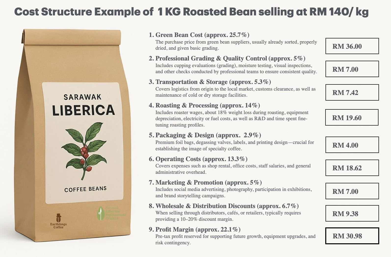 Suppose you see a 1 kg bag of roasted coffee on a city shelf priced at RM140. What should the green coffee cost for that bag be? Here is one possible breakdown: